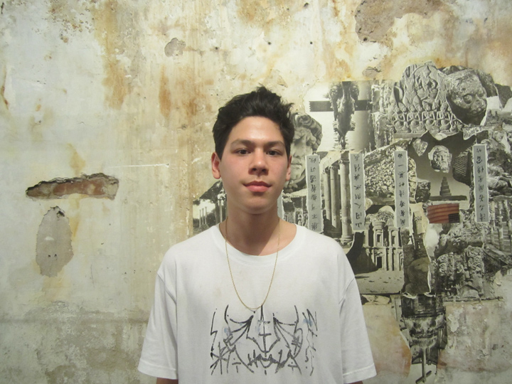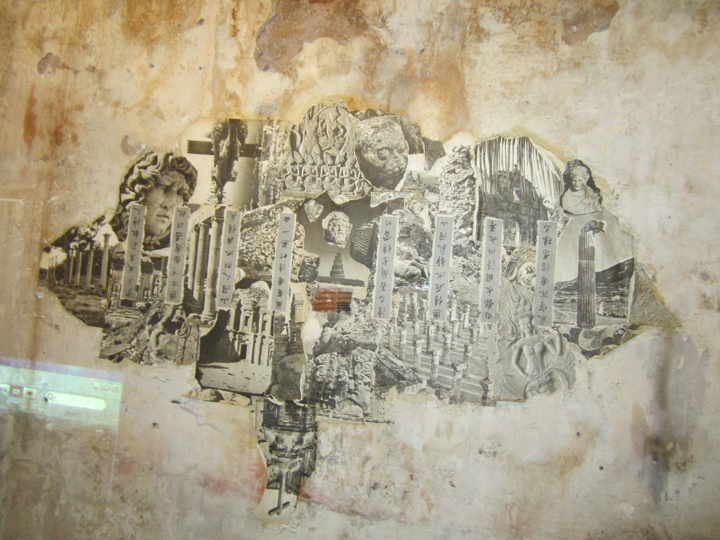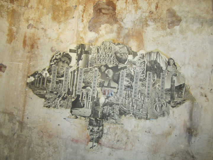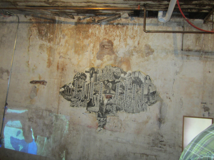a sienna grey monotone, a site specific collage . . that looked to be pasted directly onto the raw wall.