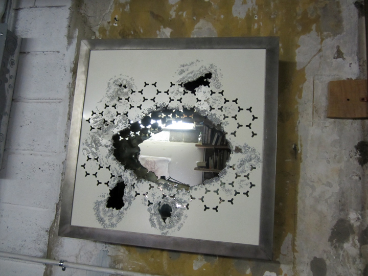 apparently those large scale cut-out, and burnt (!!) wall pieces get stacked up on top of each other – and become a kind of 3-D ‘tantric’ portrait !!