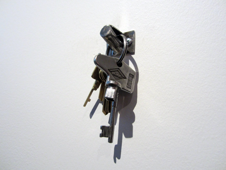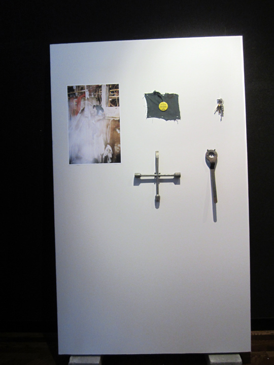 cinder block, 20 x 24′ digital print, artist jacket, artist made button, set of master keys. 4 x 8 ft.