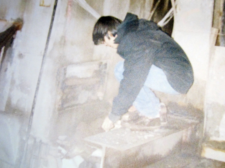 The photograph is a print of my friends Chris and Mike climbing down into the Fulton Transit Center, to a corridor that connects the center to the WTC site. That photo is from 2011.”
