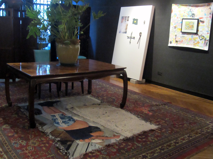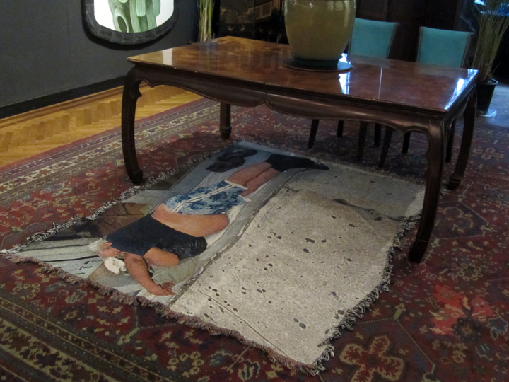 that’s a custom ‘carpet’ by tattoo artist MARK CROSS on the floor under that big piece of vintage ‘status quo’ furniture, and a ‘painting’ by JACK RIDLEY III on the wall, to the right. more on that Ridley piece – in the next post.
