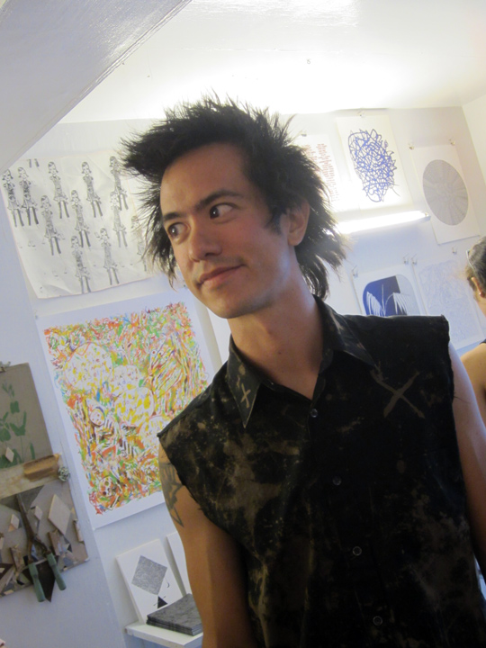 that’s one of his 2 pieces in the show, just to the right of his head . . that scramble of blue lines constituting a profile of face. titled: ‘facial recognition’, and we’re thinking . . the programming and processing that goes on beyond . . the outer layer / !!