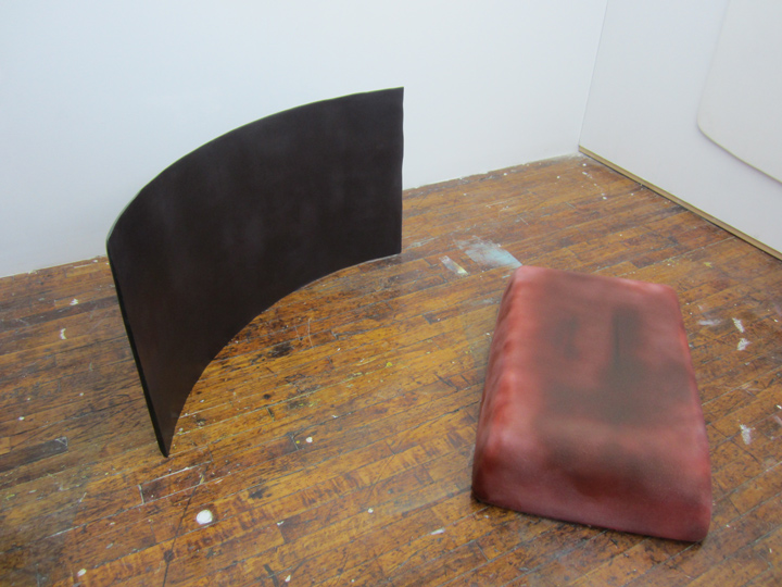 Jaena’s works are based on wooden forms that she first makes, then she paints them in mute tones with acrylic paint, and then she waxes the surface, I think ? and then finally she sands and polish rubs them into a waxy, epoxy-like, almost buttery muted leather surface.