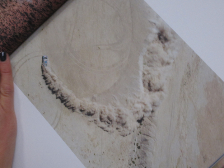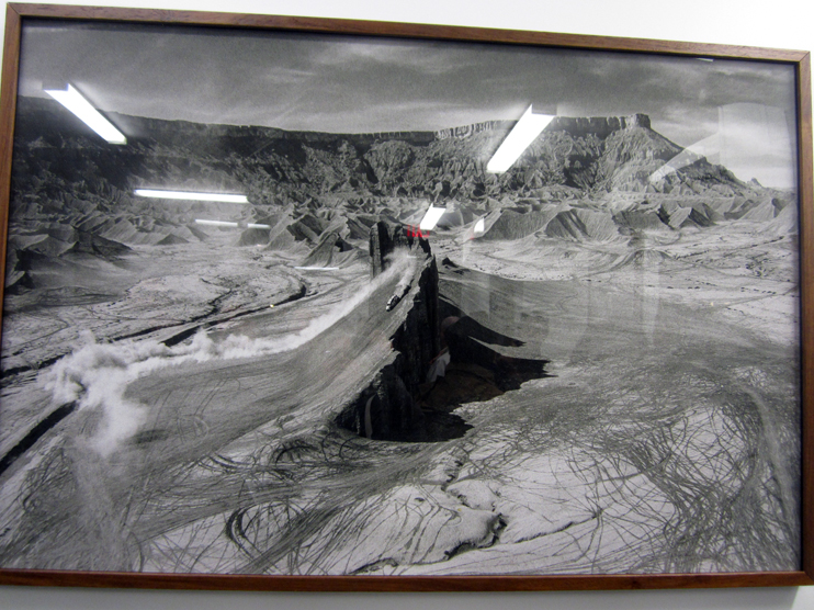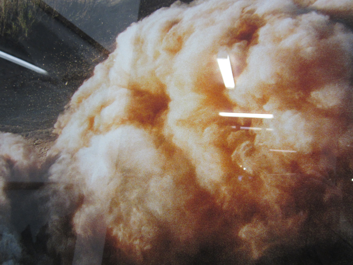 large scale photos line the small storefront gallery, JIM MANGAN took the photos from a helicopter, as driver KEN BLOCK kicked up a storm, and tore doughnuts . . into the earth.
