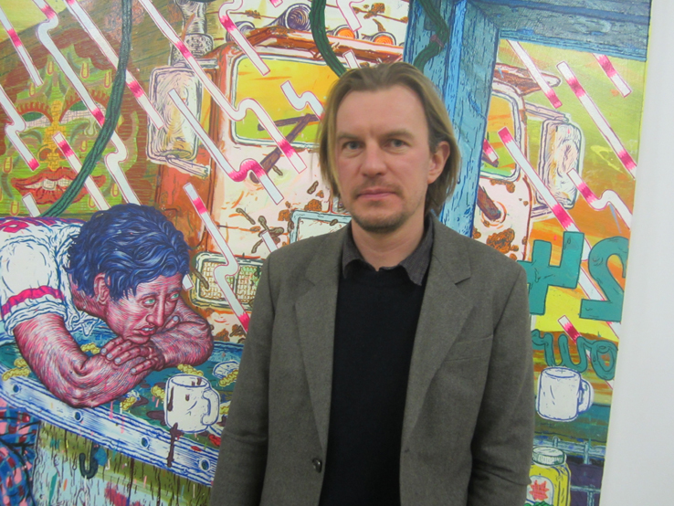 another very narrative / hyper graphic, comic book-influenced, linear draftsman-infused, edgey ‘formalist’ painter . . MATT LEINES.