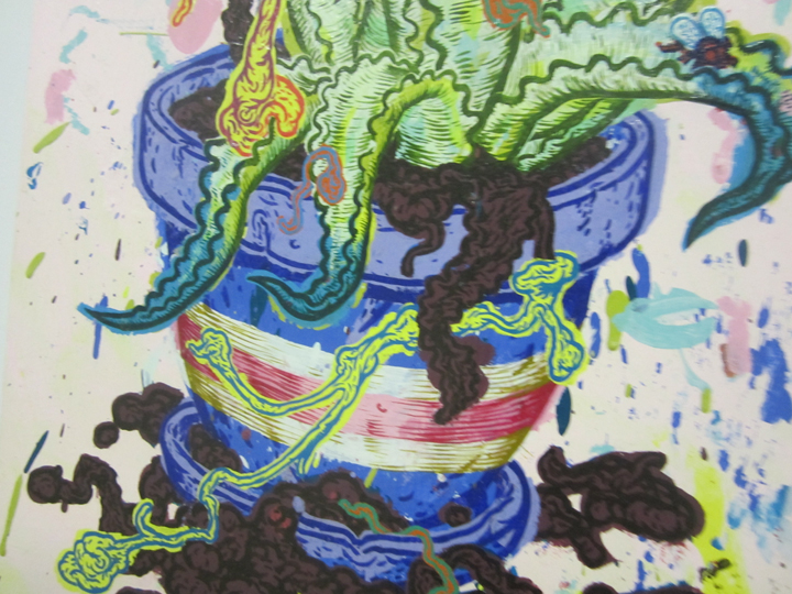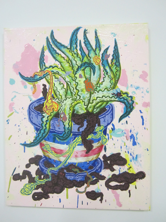 above all, this is painting that depends on drawing. you can see that not only in all those small details, that pop and squirm, and drip !! but also in how larger color fields have linear boundaries, and the superb, humorous calligraphy – is a big tip-off to the draftsmanship that rules the ‘chaos’.