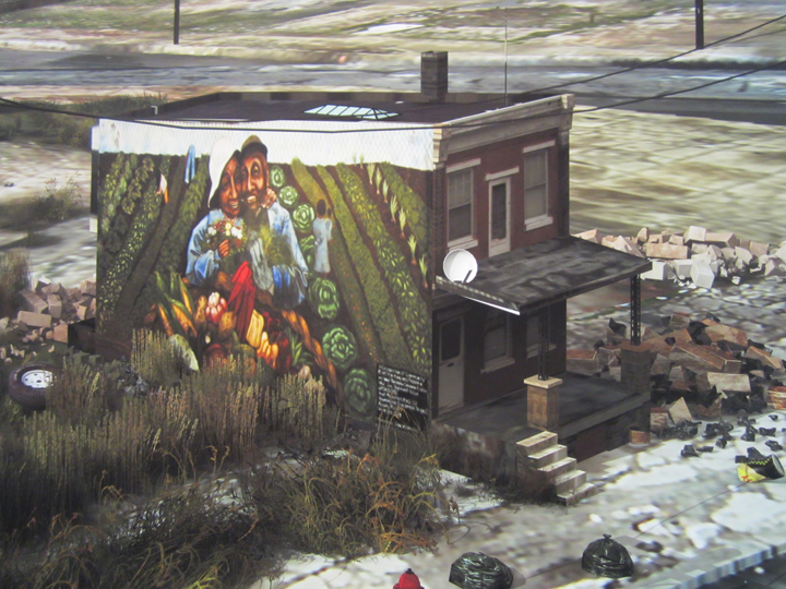 curators ELLIE CLARK and LEIGH SILVER . . titled their group exhibit: URBAN FLUX, interestingly it also included a small imaginary perhaps .. . futuristic, city headquarters as a ‘replica miniature’, and presented a larger scale photo-based work, a downtrodden urban city portrait – that was characterized by its attention to ‘minute’ . . detail.