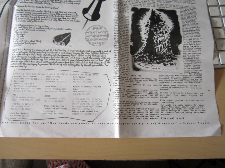at the moment a one-sheet ‘broadside’ called . . FOR THE RECORD – was the object of interest. this is the back page, an illustration/line drawing . . by JIM KREWSON.