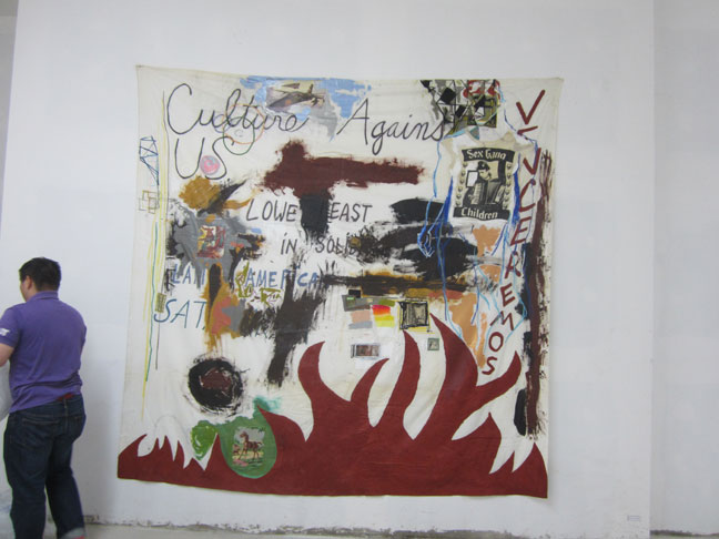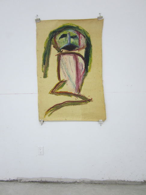 SIMON CERIGO, mixed media ‘mural’ on found curtain, that’s a found oil paint-by-number horse, on the lower left. he was crazy for those. he’d hunt them down in thrift shops.