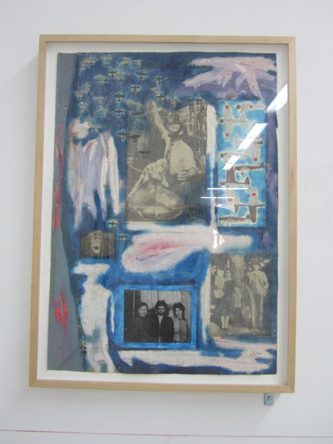 SIMON CERIGO, newspaper piece, oil stick, collage, photograph, toy airplanes.