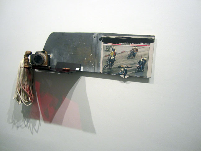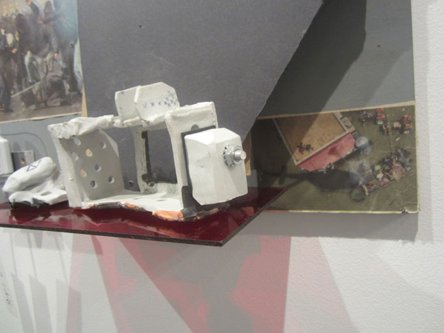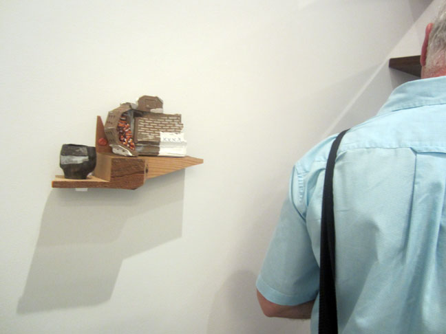 ok, so this was the only piece with a ‘ceramic’ vessel, a hand-built ‘cup’ – in it. and although the clay cup was standard size, for JJ !! the piece, and actually – all the other pieces in the show – were actually kind of mini / nano in size – for what they actually were, which was wall- mounted multi-media sculptures – that posed many strange and wonderful objects against – the bad news of our cruel, nasty world as it turns, on its axis !! and pulls us along.