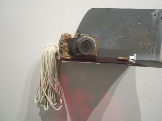 Stoneware, photograph, pine, aluminum, acrylic, rope, and paint.