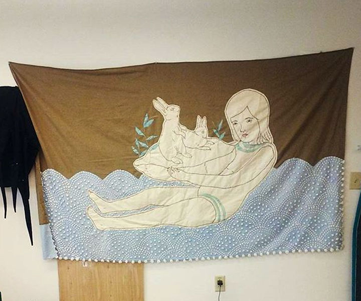 commentary: owl image by Andrew Guenther, cut-out from the card for his show – SIMON CERIGO curated in May 2007. in a Chelsea, NYC gallery & used as a ‘heading’ from which a paper banner hung, paper banner by Nancy Smith – made for her OTHER MUSIC show, NYC 2009.