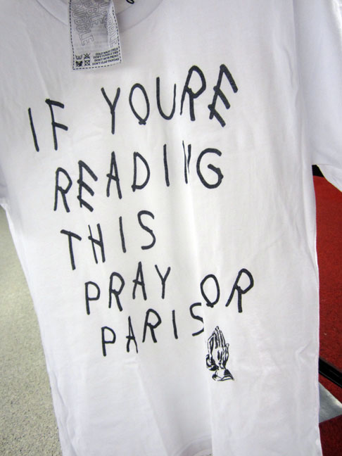 ‘NEVER WASTE A GOOD CRISIS’ / JIM JOE: ‘PRAY FOR PARIS’ T-SHIRT – EXHIBITED/PRODUCED . . BY SEAN VEGEZZI