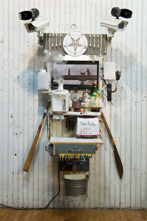 TOM SACHS, ‘Breakfast’, 2016. Wood, steel, stoneware, porcelain, toaster, tv, pirated DVDs, water boiler, coffee, sugar, maple syrup, whiskey, stereo amplifier, speakers, surveillance cameras, loudspeaker, epoxy resin and fiberglass. 70 x 42 x 30 in.