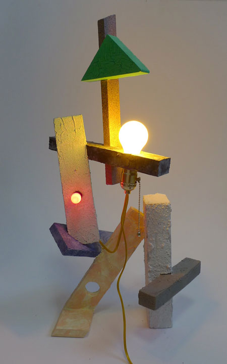 Latex paint, spackle, stucco, concrete patch, and faux stone on wood with light bulb, socket and cord.