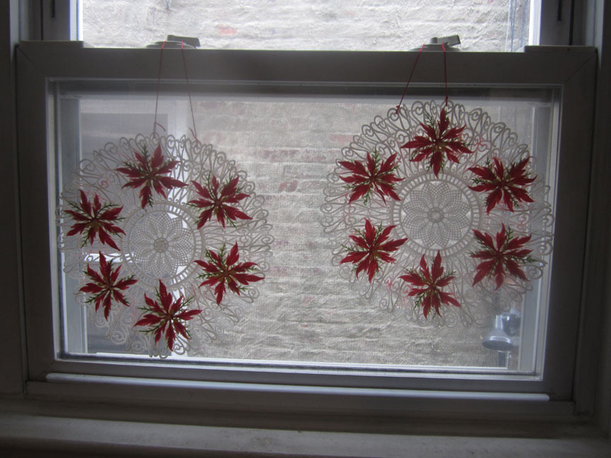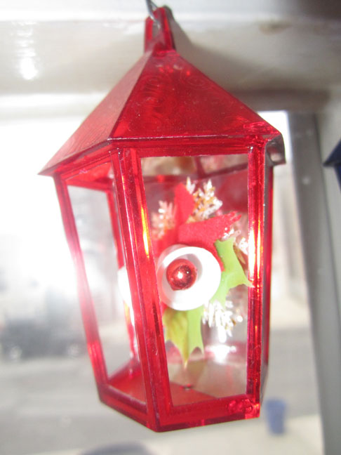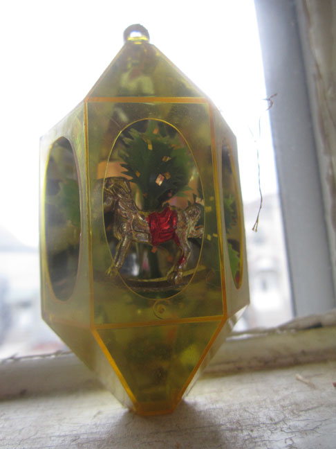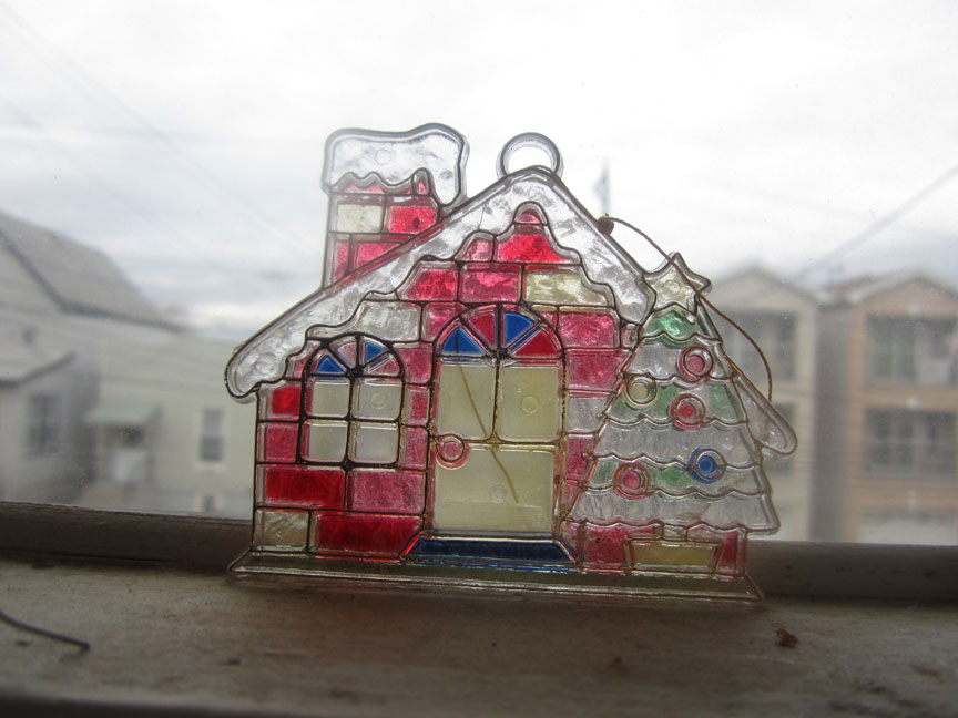 but, then I found this, a kind of mid-century modern, faux stained glass . . suburban house ornament, really magic in the light dept. other years, I would have completely overlooked this as: tacky.