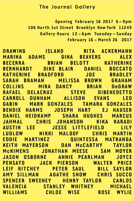 ~’DRAWING ISLAND’ . . incl. JOE BRADLEY, TAYLOR McKIMENS, SARAH BRAMAN, MELISSA BROWN. LEIF RITCHEY & CARROLL DUNHAM / THE JOURNAL GALLERY, BROOKLYN – OPENS TO-NITE, THURS FEB 15