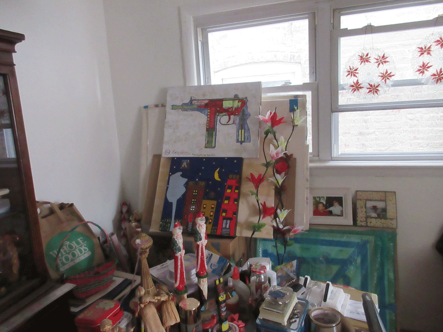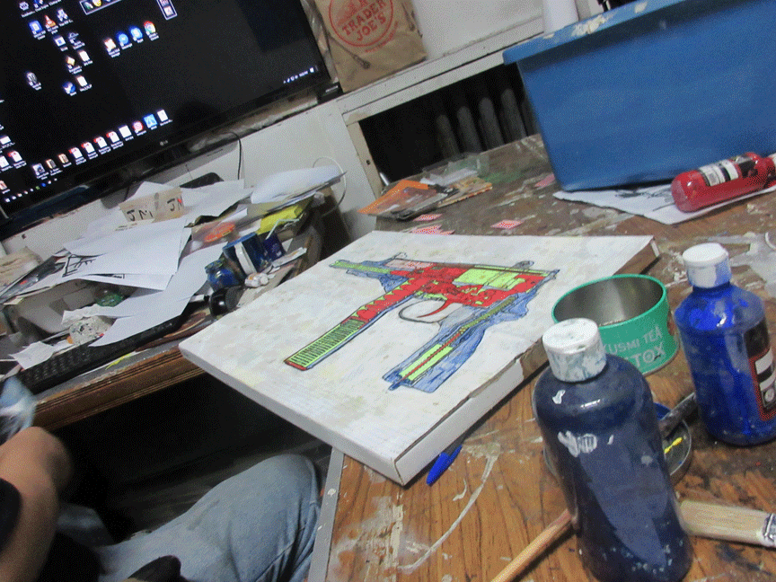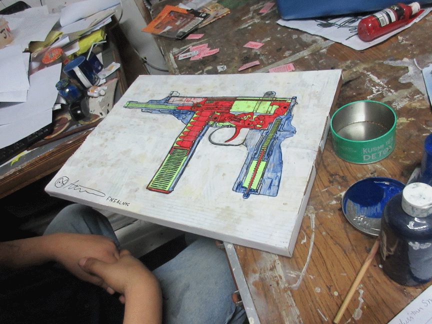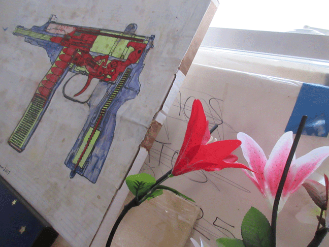 a lot of people are fascinated with guns, and gun imagery, but I always felt Alfredo’s obsession, came from a deeper depth / from the authenticity of an outsider, brought up in the real, rough & tumble of the deeper dark outer impoverished hoods of NYC, where a ‘Saturday Night Special’ had real meaning. and currency.