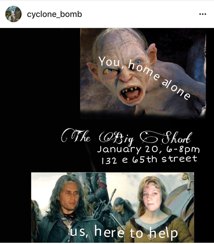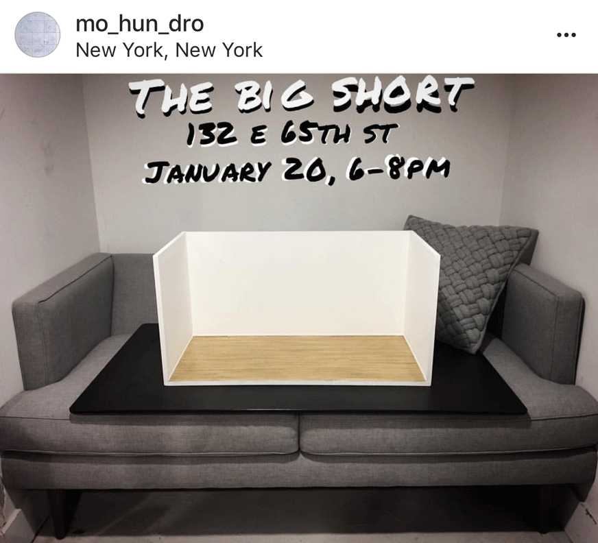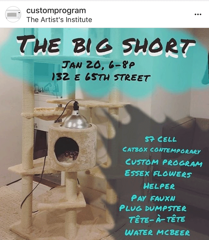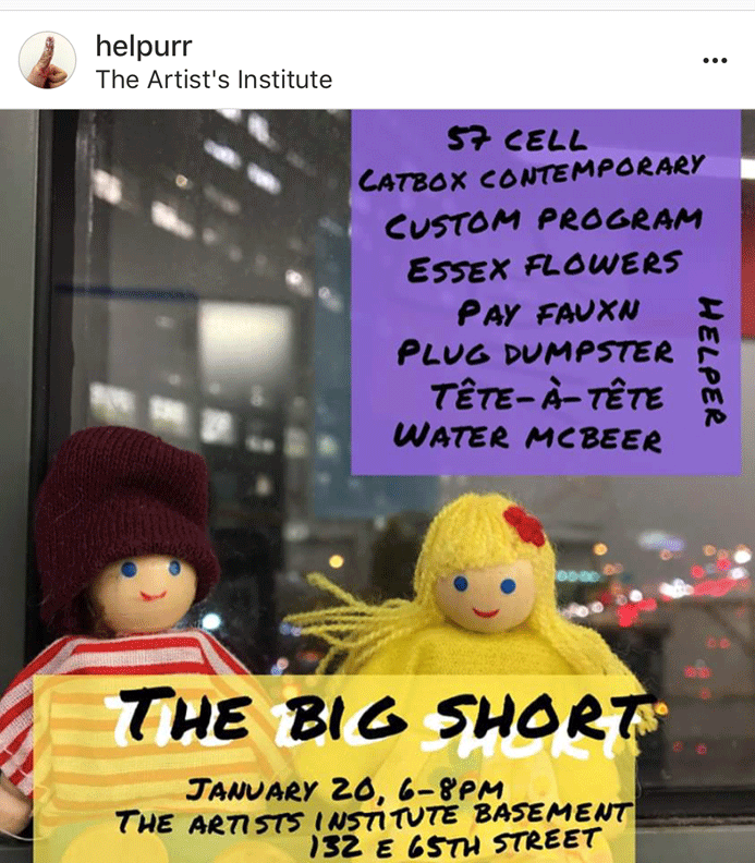 ~’THE BIG SHORT’ . . 57 CELL, CATBOX CONTEMPORARY, CUSTOM PROGRAM, PAY FAUXN, PLUG DUMPSTER, TETE-A-TETE, WATER MCBEER, ESSEX FLOWERS, HELPER / THE ARTISTS INSTITUTE BASEMENT / OPENS TO-NITE SAT