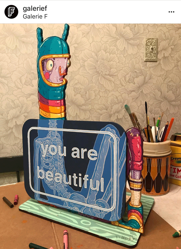 acrylic paint & custom cut wood embellishment – on YAB miniature billboard kit for 2017 / Galerie F FAB group show.