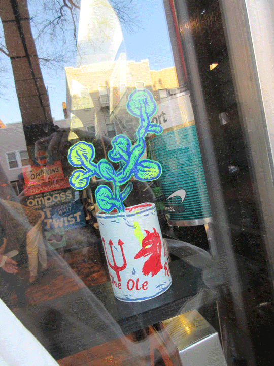 another TAYLOR McKIMONS, in the Muddguts storefront window at sunset / so . . . Brooklyn.