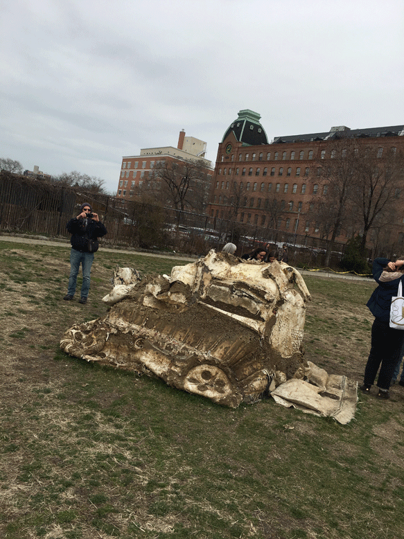 “A pair of enormous limp silicone machines, the Park’s compact loader, and a decommissioned bulldozer, that will lie sprawled across Socrate’s lawn. Cast from working pieces of equipment involved with traces of dirt, rust and debris, the sculptures can be understood as a meditation on global patterns of industrial production, material circulation, and the sustainablity of existence on earth.”