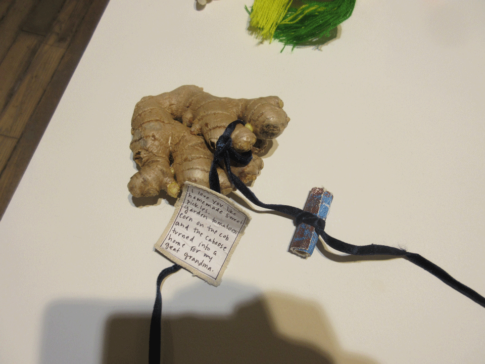 ginger, velvet string, and fabric (with attached paper) / 1.25 x 4 x 12 in.