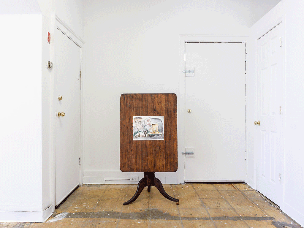 wood table, MEGANE VOGHELL drawing, avocado pit /48 x 36 x 22 in.
