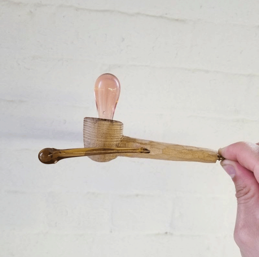 DANIEL GIORDANO, small smoky-light pink colored light bulb, wooden pipe with even smokier, sensual glass form / 3-D sculpture.