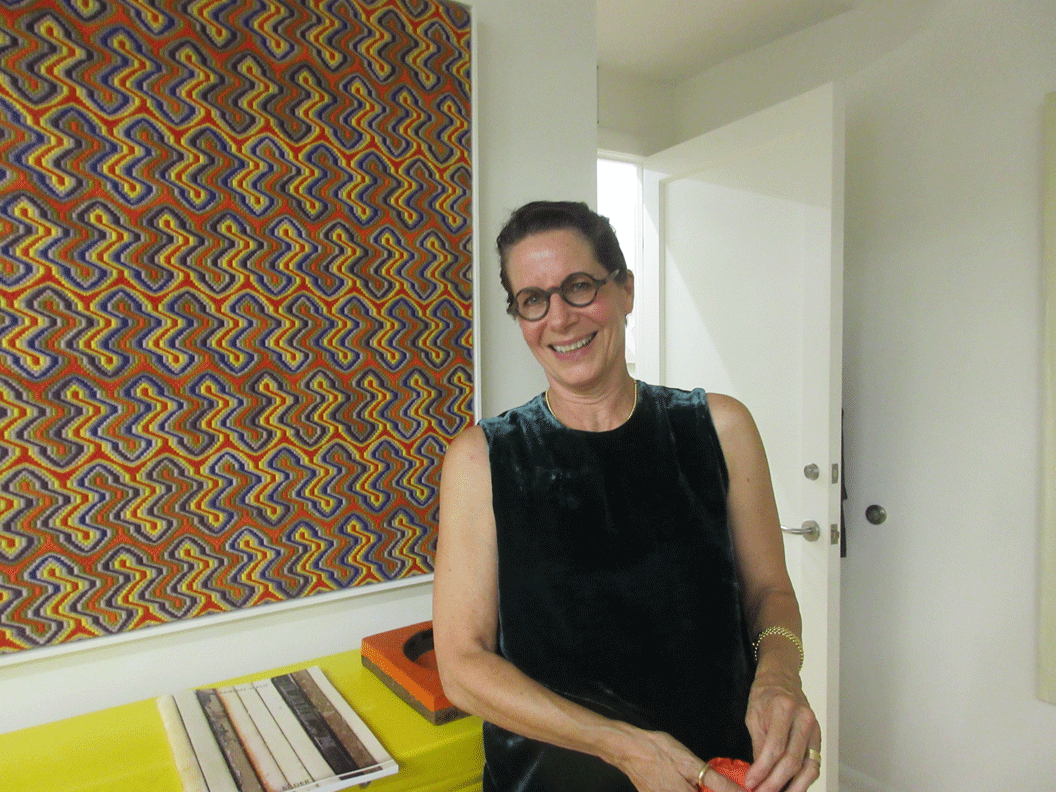 SUE RAVITZ, owner/director of 57W57ARTS, with her own . . ‘handiwork’ – behind her.