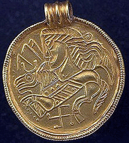 a ‘bracteate, from approx AD 400, which features the ‘charm’ word: ‘ALU’, with a depiction of a horse & a man’s head, & a swastika. apparently the exact meaning of the word ‘Alu’ . . is under some dispute, but it is generally agreed upon to ‘represent’ . . ‘an instance of historical runic magic’. it is the most common of the early runic .. ‘charms’.