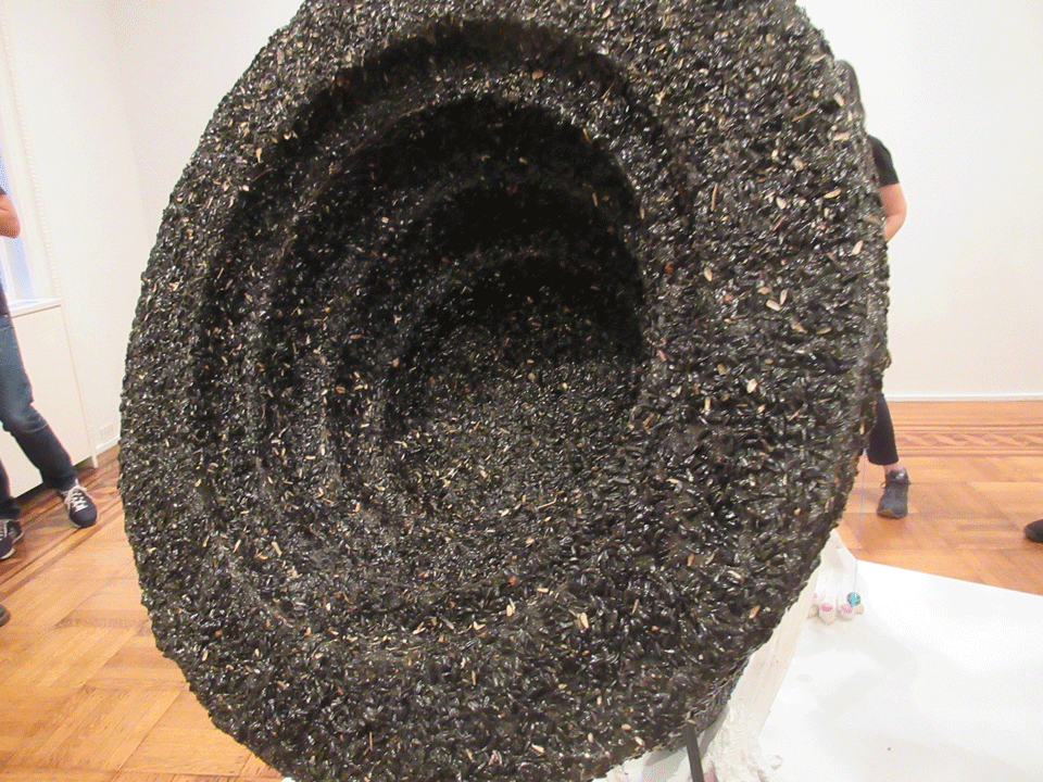 Plaster, burlap, hydrocal, polystyrene, pigment, flashe, shellac, polyester, resin, cotton string, paper pulp, steel, plywood, polymer clay, foam-coat, acrylic, Black Oil Sunflower Seed / 65 x 84 x 37 in.