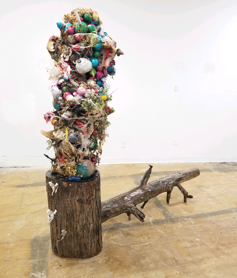 Wood, deep-fried batter, glazed ceramic, Christmas tree ornaments, railroad spikes, tin, aluminum,