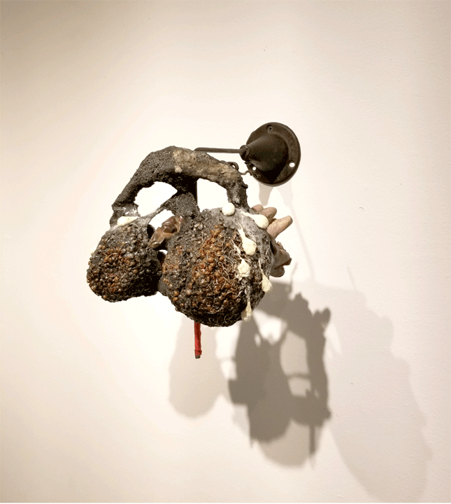debris, tape, epoxy, phosphorescent acrylic, urine, wire hanger, hardware.