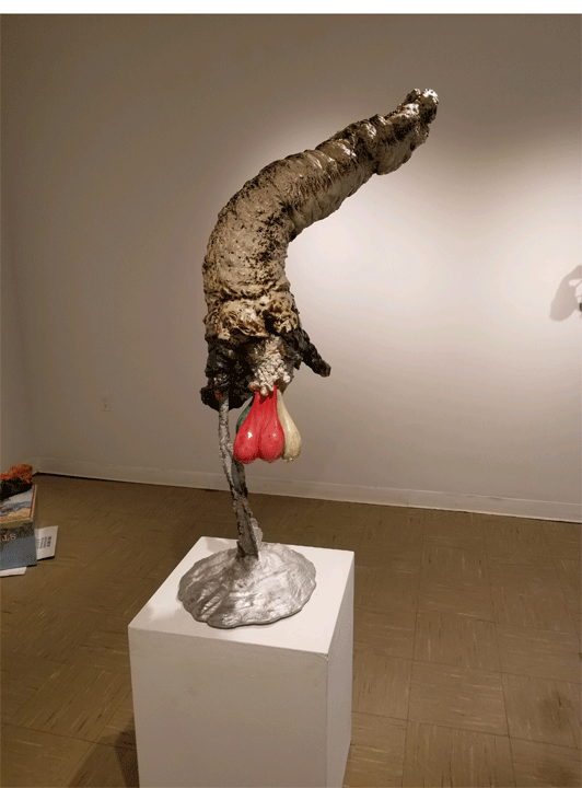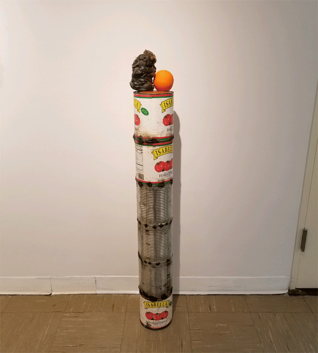 Glazed ceramic, goat skin cock rings, Tang drink mix, artificial navel orange, canned tomatoes, epoxy.