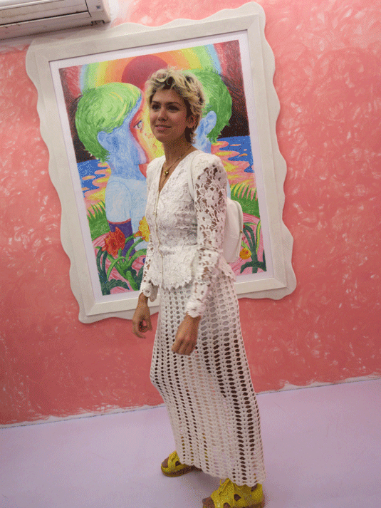 behind her a large drawing on paper / in an artist-made frame, which she fabricated