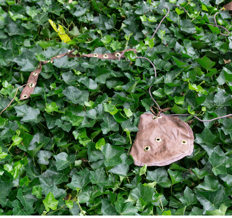 copper, bronze, Miracle-Gro (TM) patina, leather, brass grommets, hand-dyed rope.
