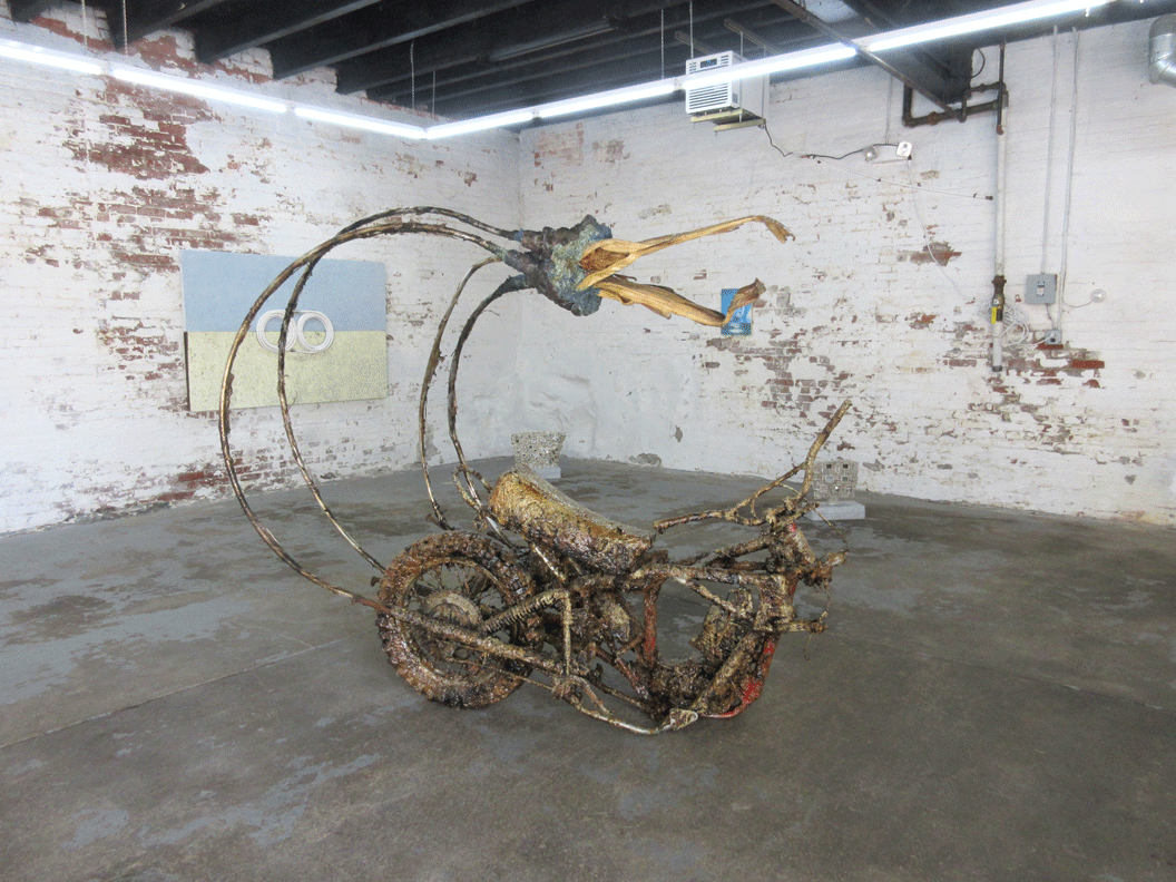 1970s Husqvarna motocross bikes, deep-fried batter, glazed ceramic mermaids, steel, aluminum, railroad spikes, phosphorescent acrylic, Canadian maple syrup, urinal cake, cattails, epoxy, plastic wrap.