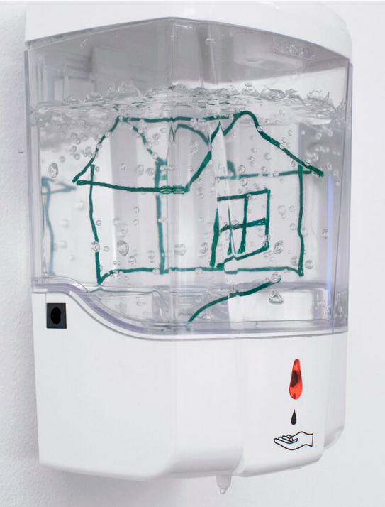 on a (recycled) well-designed / industrial design / transparent / commercial . . hand sanitizer dispenser.
