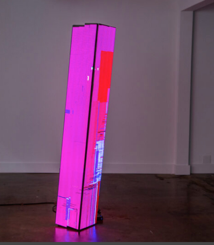 “MURPHY . . . works with the LED screens we often see outside advertising the next big thing. He sees LED screens as part of the landscape, and although these light panels are intended to be selling machines, Murphy views them as beautiful, chatty companions, so he uses them as his primary medium, undermining their form and function.