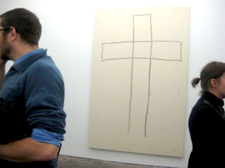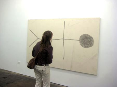“The best of these bare minimum works was a series of enormous raw canvases that boasted a single motif outlined in black oil crayon.