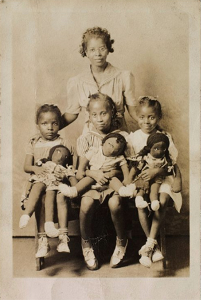 Unidentified photograph, Woman and Children with Black Cloth, handmade Dolls, 1942.