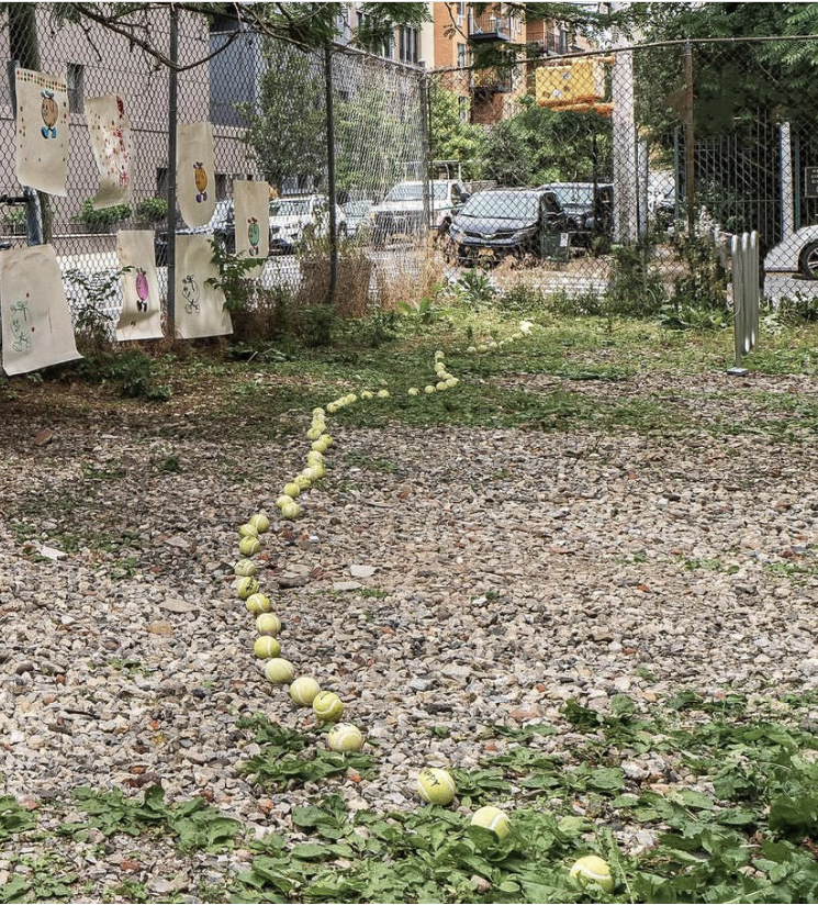LU ZHANG has some confrontational, faux tennis balls . . laid out in a kind of mental ‘trail’,